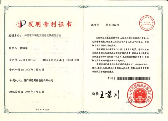 | 福建省第二批专利工作试点企业 | 发明专利证书(一种车辆越界报警的越界确定方法) | 发明专利证书(一种传送车辆的卫星定位数据的方法) |
